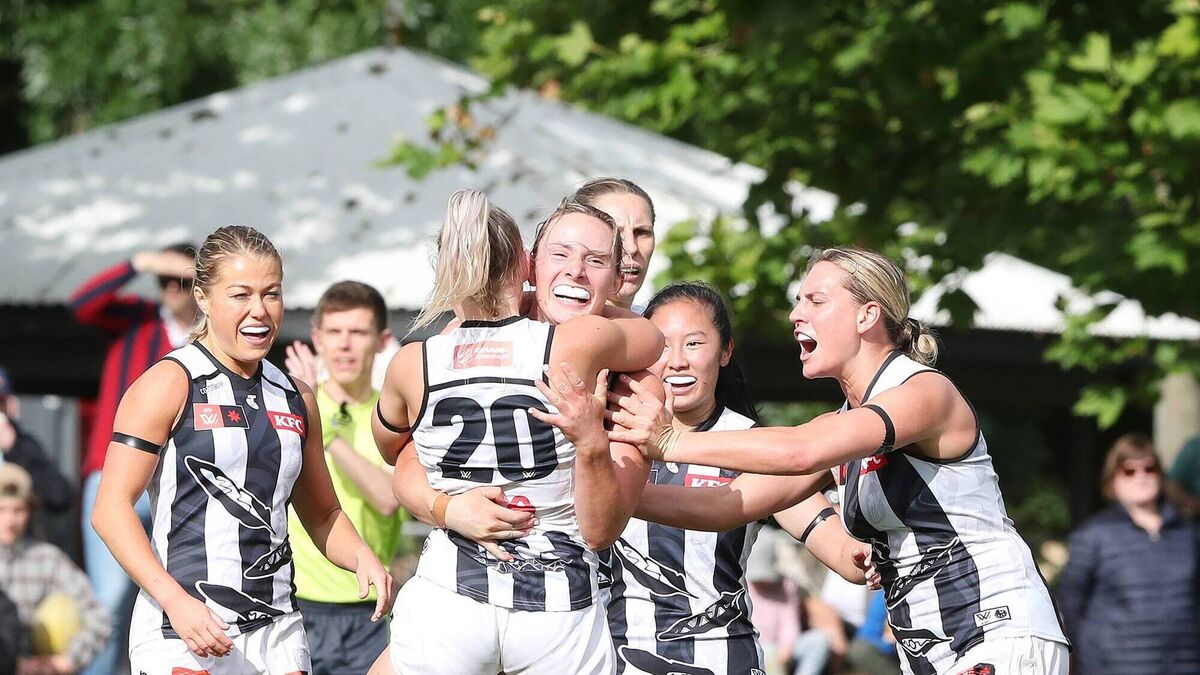 Eliza James of the Magpies celebrates a goal with Charlotte Taylor and teammates, including Sarah Rowe, left. Picture: Sarah Reed/AFL Photos via Getty Images