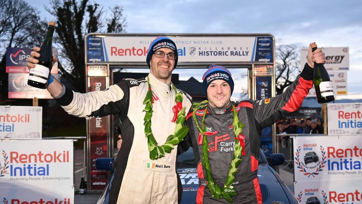 TAKING THE SPOILS: Belfast's Jonny Greer (right) and his Sligo co-driver Niall Burns celebrate their victory in the Rentokil-Initial Killarney Historic Rally. Pic: Martin Walsh.