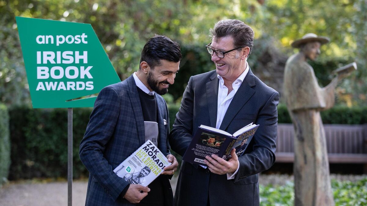 NOMINATED: Shortlisted authors Zak Moradi and Roddy Collins pictured at the unveiling of the shortlist for the An Post Irish Book Awards 2022 at The Museum of Literature Ireland. Pic: Patrick BolgerÂ