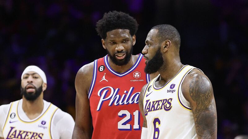 CHAT: Joel Embiid of the Philadelphia 76ers and LeBron James of the Los Angeles Lakers speak during the fourth quarter at Wells Fargo Center in Philadelphia, Pennsylvania. Pic: Tim Nwachukwu/Getty Images