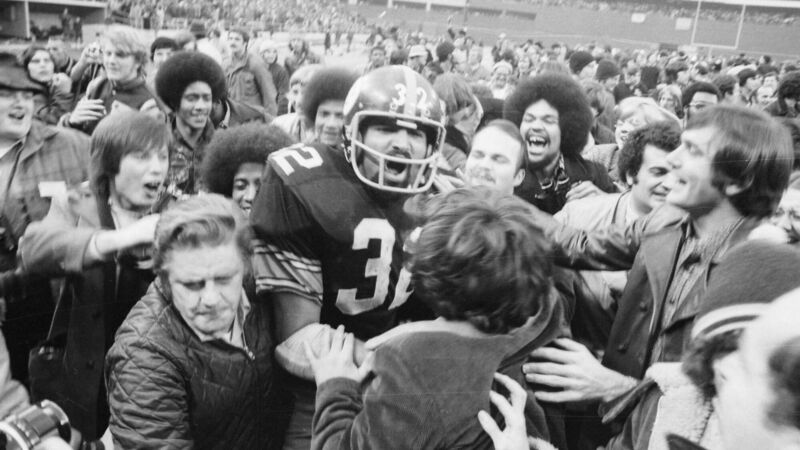 IMMACULATE: Pittsburgh Steelers' running back Franco Harris is mobbed by fans at Three Rivers Stadium after scoring the winning touchdown in the AFC semi-final against Oakland. Harris made the touchdown on a tipped pass from quarterback Terry Bradshaw to Frenchy Fuqua to Harris for the score in the fourth quarter.