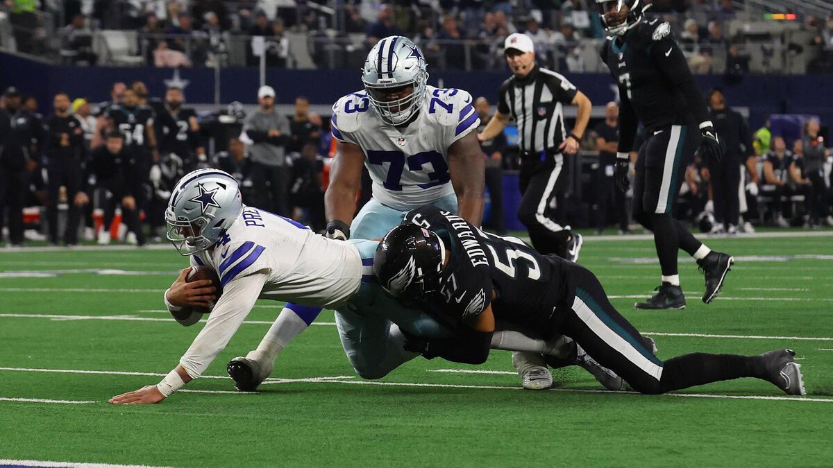 GOALLINE DEFENCE: Cowboys QB Dak Prescott is halted by TJ Edwards of the Philadelphia Eagles at AT&T Stadium