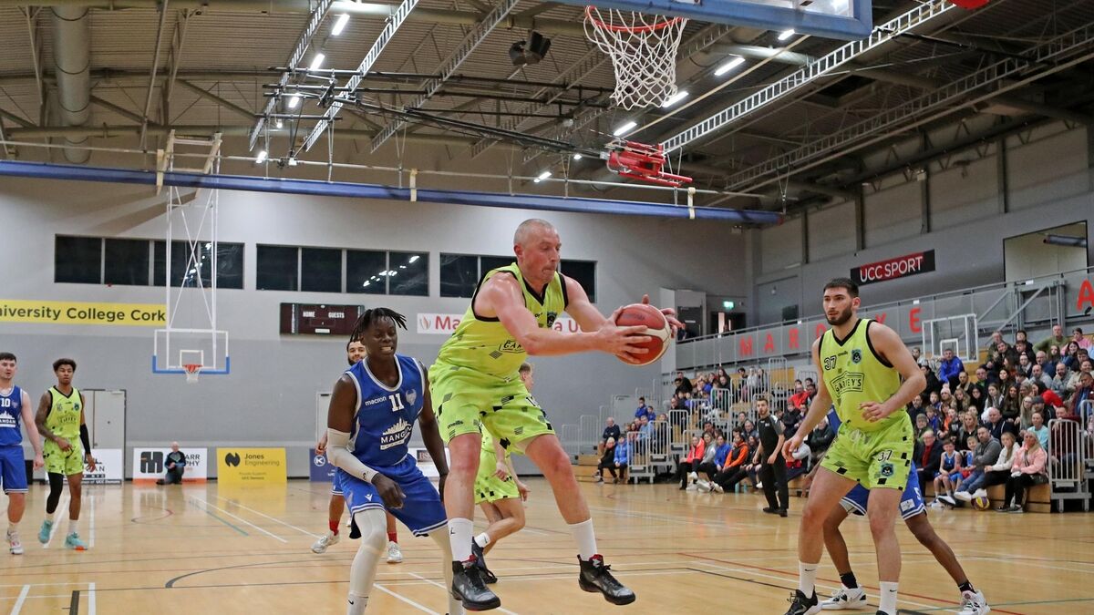 BOSSING THE PAINT: Tala Fam Thiam, UCC Demons, Kieran Donaghy, Garvey's Tralee Warriors. Pic: Jim Coughlan.