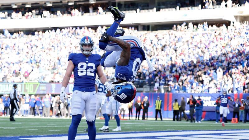 HEAD OVER HEELS: Richie James of the New York Giants celebrates a touchdown against the Indianapolis Colts. Picture: Jamie Squire/Getty Images