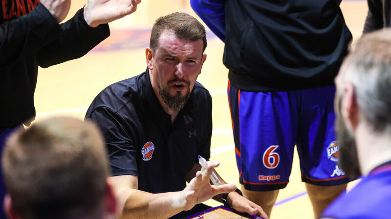 HUDDLE UP: DBS Eanna head coach Darren McGovern issues instructions during the Basketball Ireland InsureMyHouse.ie Pat Duffy Cup semi-final against Ballincollig. Picture: INPHO/Ryan Byrne