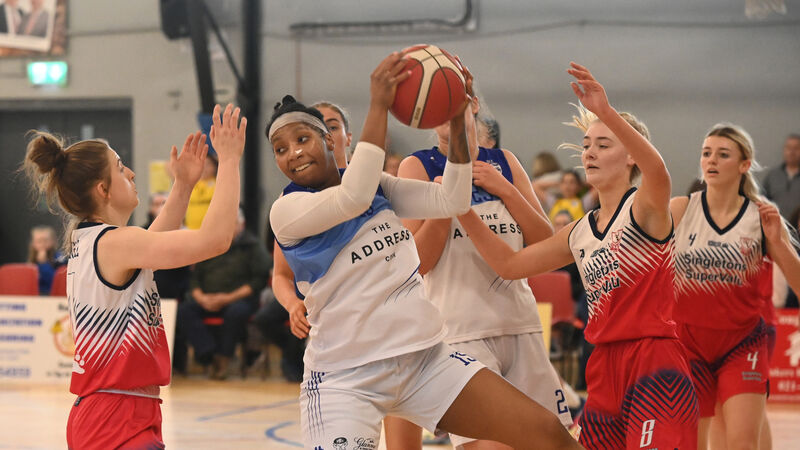 12th February 2023 The Address UCC Glanmire's Khiarica Rasheed under pressure from Singleton's SuperValu Brunell 's Edel Thornton and Lauryn Homan during the Women's Super League at the Parochial hall. Picture; Eddie O'Hare