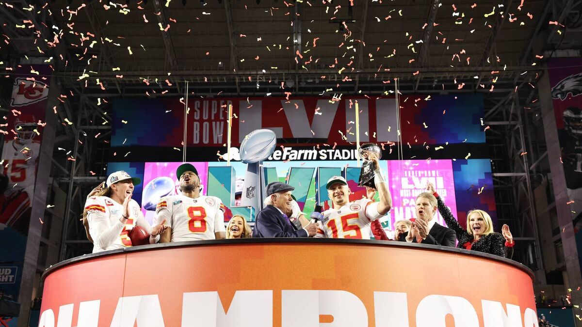 GLENDALE, ARIZONA - FEBRUARY 12: Patrick Mahomes #15 of the Kansas City Chiefs celebrates with the the Vince Lombardi Trophy after defeating the Philadelphia Eagles 38-35 in Super Bowl LVII at State Farm Stadium on February 12, 2023 in Glendale, Arizona. (Photo by Christian Petersen/Getty Images)