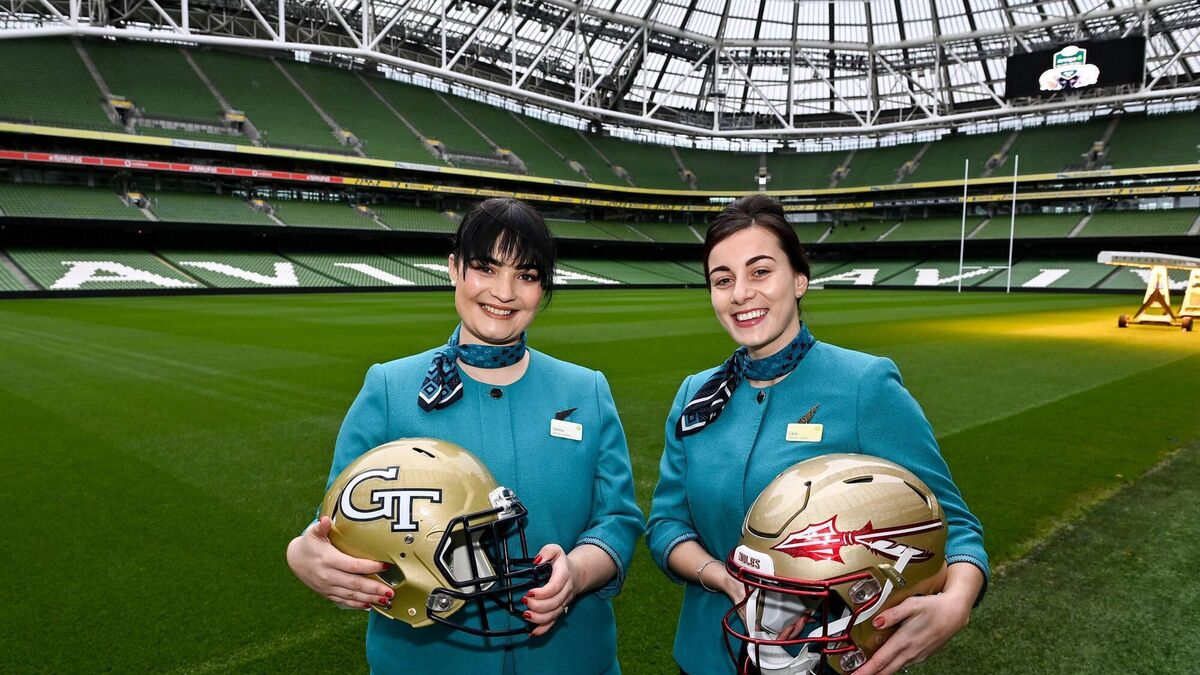 LIFT OFF: Aer Lingus Cabin Crew, Samia Jalal and Cara Dunne, pictured on Wednesday 15th March as the two teams, Georgia Tech and Florida State University, were revealed to contest the 2024 edition of the Aer Lingus College Football Classic at the Aviva Stadium in Dublin. Photo by Piaras Ó Mídheach/Sportsfile