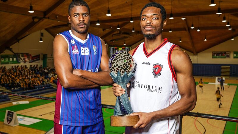 HISTORY BECKONS: Pictured at a media event ahead of this weekend’s Basketball Ireland National League Finals is University of Galway Maree's Malik Thiam and Emporium Cork Basketball's John Dawson. Pic: INPHO/Laszlo Geczo