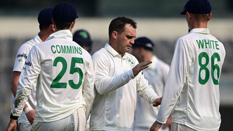SIX WICKETS: Ireland's Andy McBrine (C) celebrates with teammates after taking the wicket of Bangladesh's Mushfiqur Rahim (not pictured) during the second day of the Test match at the Sher-e-Bangla National Cricket Stadium in Dhaka. Pic: Munir Uz Zaman/AFP via Getty Images