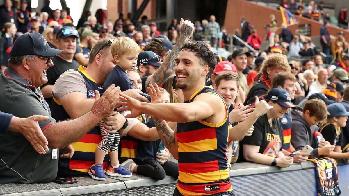 STAMP IT OUT: Izak Rankine of the Crows with fans after the win during the 2023 AFL Round 04 match between the Adelaide Crows and the Fremantle Dockers. Pic: Sarah Reed/AFL Photos via Getty Images