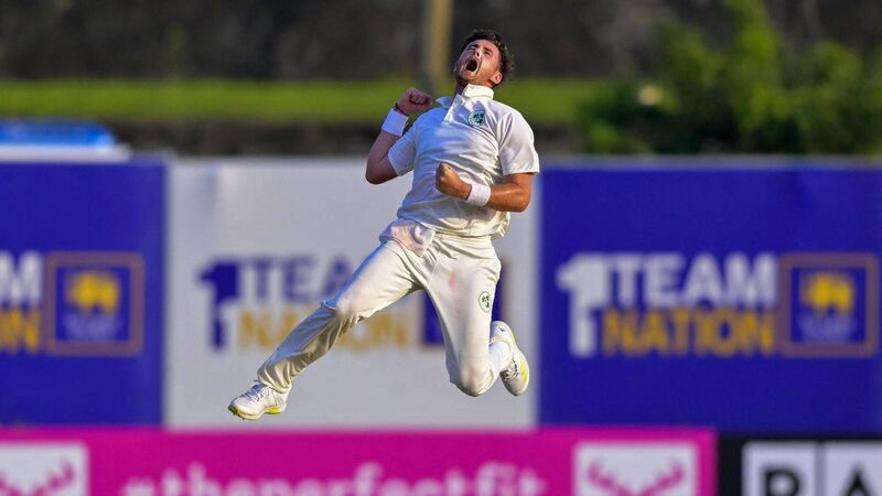 JUMPING FOR JOY: Ireland's Mark Adair celebrates after the dismissal of Sri Lanka's Dimuth Karunaratne during the first day of the Test match at the Galle International Cricket Stadium in Galle. Pic: Ishara S Kodikara/AFP via Getty Images