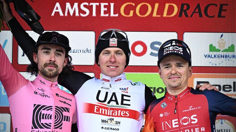 Ireland's Ben Healy of EF Education-EasyPost (left), Slovenian Tadej Pogacar of UAE Team Emirates and British Tom Pidcock of Ineos Grenadiers celebrate on the podium of the men elite 'Amstel Gold Race' one day cycling race. Pic: Jasper Jacobs/Belga Mag/Belga via AFP via Getty Images