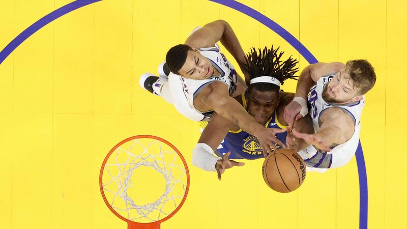 UP FOR IT: Kevon Looney of the Golden State Warriors goes up for a shot on Keegan Murray and Domantas Sabonis of the Sacramento Kings during Game Six of the Western Conference First Round Playoffs at Chase Center in San Francisco, California. Pic: Ezra Shaw/Getty Images