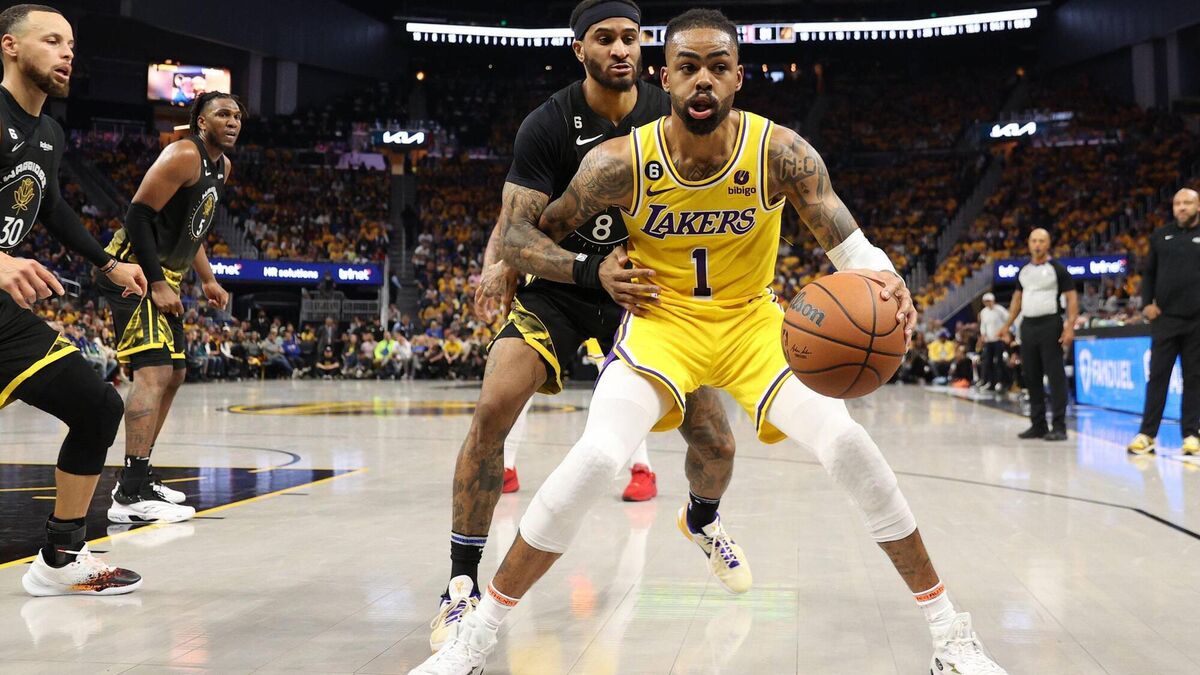 ROAD WIN: D'Angelo Russell of the Los Angeles Lakers handles the ball against Gary Payton II of the Golden State Warriors during the second quarter in game one of the Western Conference semi-final playoffs at Chase Center in San Francisco. Pic: Ezra Shaw/Getty Images)