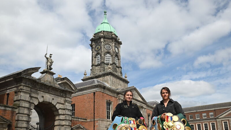 BELT UP: Katie Taylor, left, and Chantelle Cameron during a media conference, held at Dublin Castle, ahead of their undisputed super lightweight championship fight. Picture: Stephen McCarthy/Sportsfile