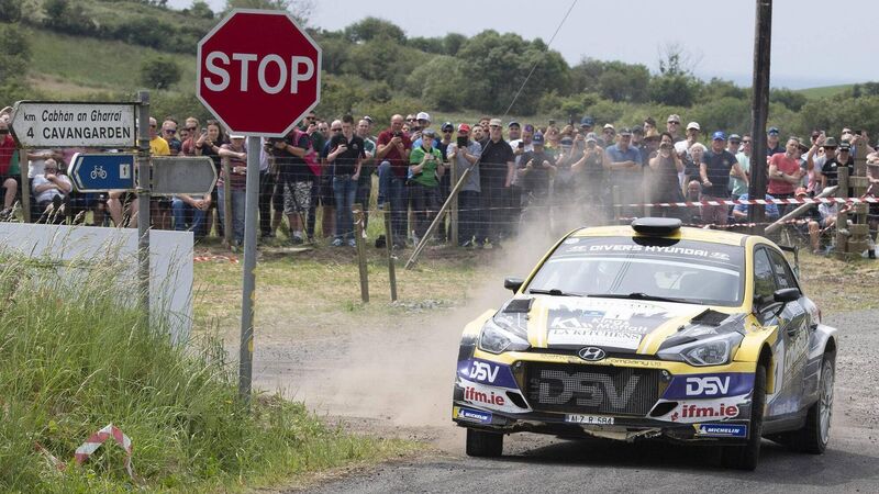 NO STOPPING HIM: Monaghan’s Josh Moffett (Hyundai i20 R5) and his Wexford co-driver Andy Hayes lead the way after the opening day of the Wilton Recycling Donegal International Rally, round five of the Irish Tarmac Rally Championship. Picture: Martin Walsh.