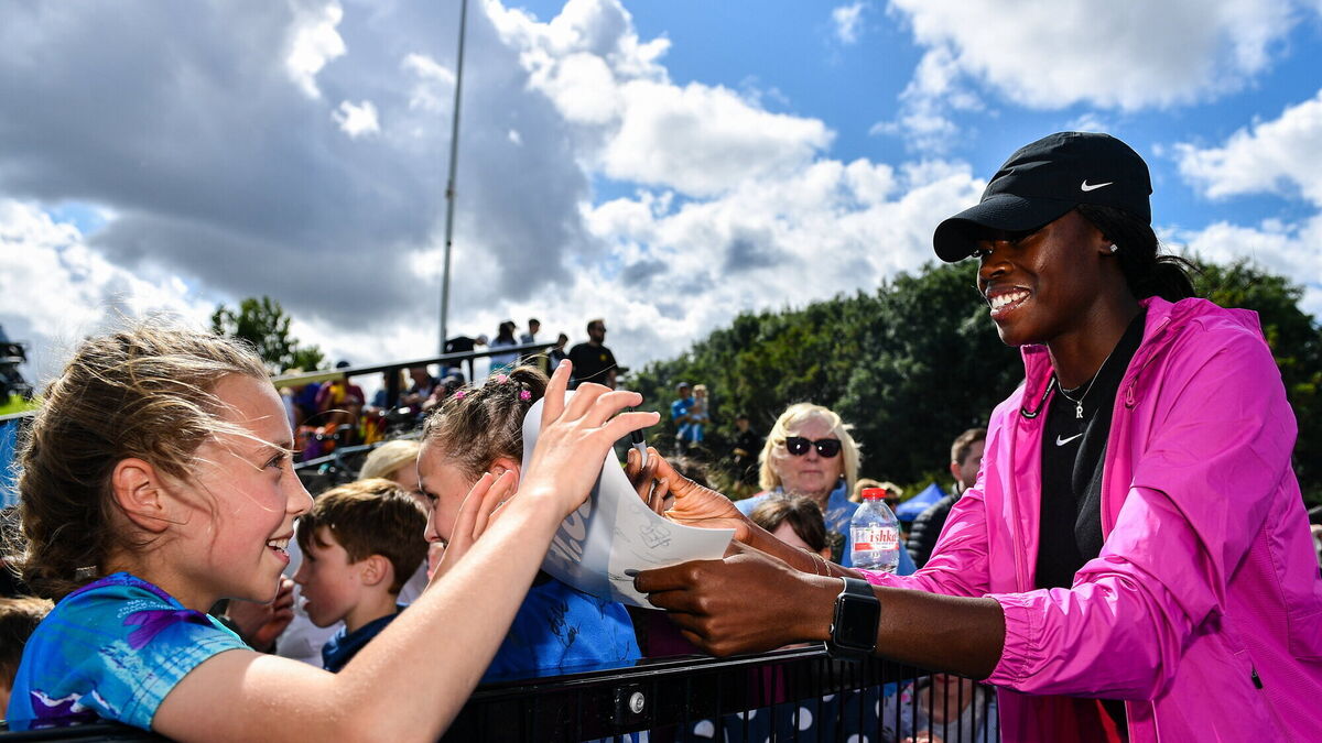 STAR-SPRINTER: Rhasidat Adeleke of Tallaght AC, Dublin, right, who recently turned professional, signs autographs for spectators. Pic: Sam Barnes/Sportsfile