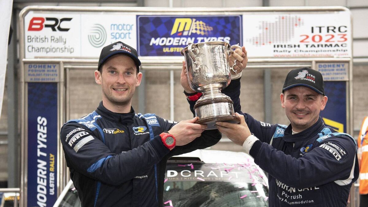 TARMAC CHAMPIONS: Derry's Callum Devine (right) and Killarney's Noel O' Sullivan lift the Bertie Fisher Perpetual Trophy after they clinched the Samdec Securities Irish Tarmac Rally Championship on the Modern Tyres Ulster Rally in Newry. Pic: Martin Walsh.