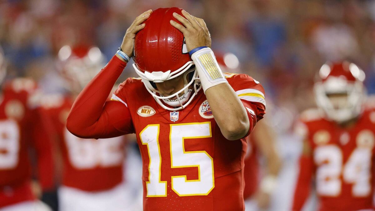 POOR START: Patrick Mahomes of the Kansas City Chiefs reacts in the final plays of the fourth quarter against the Detroit Lions. Picture: David Eulitt/Getty Images