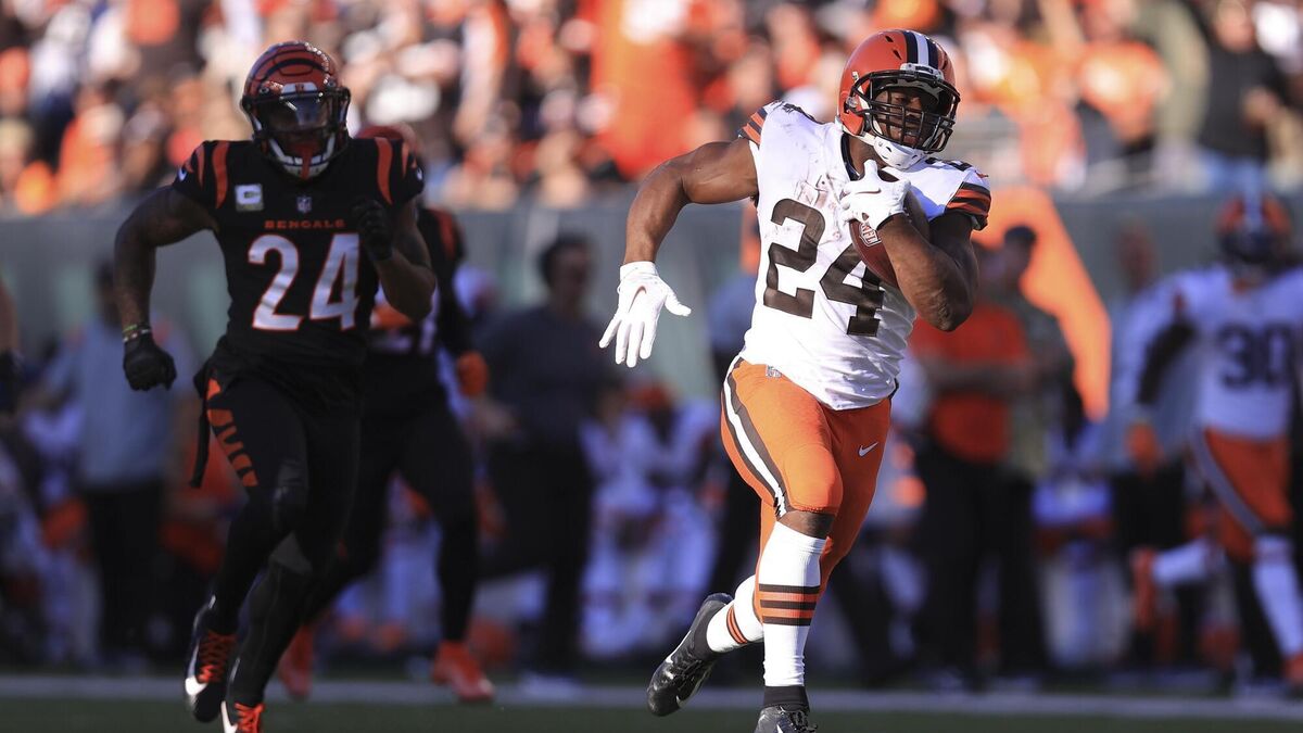 Cleveland Browns' Nick Chubb runs past Cincinnati Bengals' Vonn Bell for a touchdown during the second half of an NFL football game, Sunday, Nov. 7, 2021, in Cincinnati. (AP Photo/Aaron Doster)