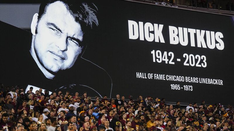 LEGEND: A graphic honoring Dick Butkus prior to an NFL football game between the Chicago Bears and the Washington Commanders at FedEx Field. Picture: Cooper Neill/Getty Images