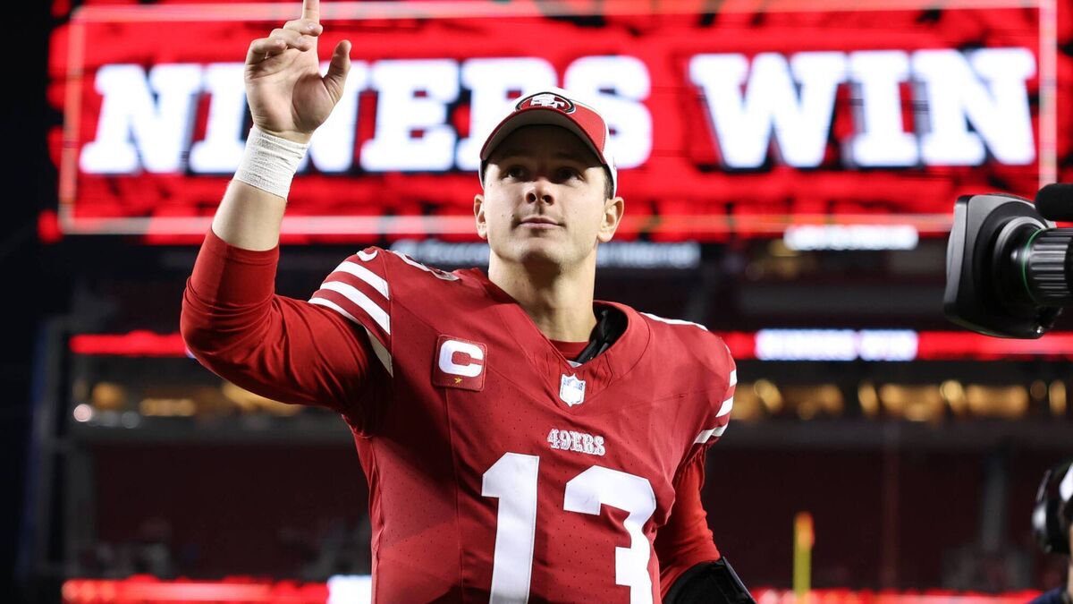 IN FORM: Brock Purdy of the San Francisco 49ers reacts after a 42-10 victory against the Dallas Cowboys at Levi's Stadium. Picture: Ezra Shaw/Getty Images