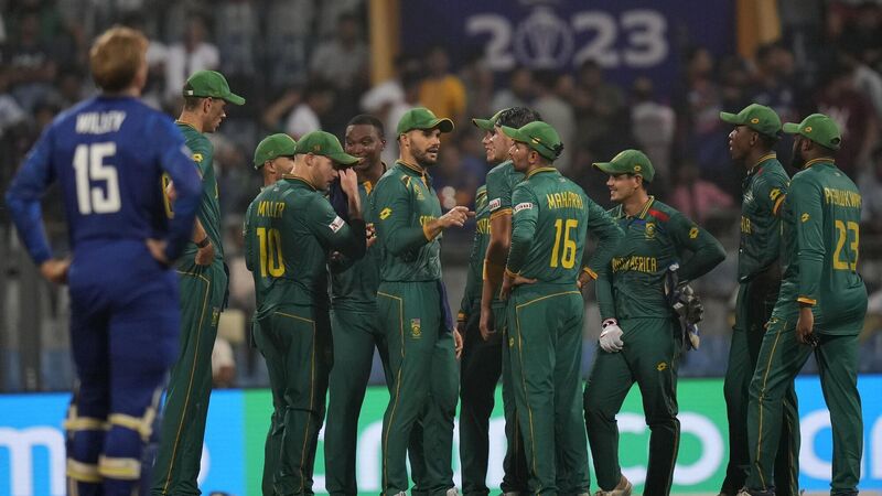 OUT YOU GO: South African players celebrate the dismissal of England's Adil Rashid during the ICC Men's Cricket World Cup match between England and South Africa in Mumbai, India, Saturday, Oct. 21, 2023. Pic: AP Photo/Rajanish Kakade