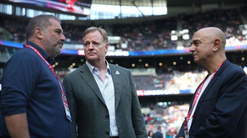 NFL Commissioner Roger Goodell, Tottenham Hotspur manager Ange Postecoglou and Tottenham Hotspur chairman Daniel Levy. Photo credit: Simon Marper/PA Wire.