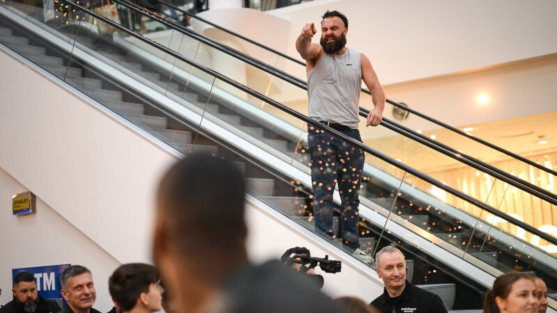 22 November 2023; TikToker "The Shadow Boxer" shouts in the direction of Thomas Carty during public workouts, held at Liffey Valley Shopping Centre in Clondalkin, Dublin. Photo by Stephen McCarthy/Sportsfile
