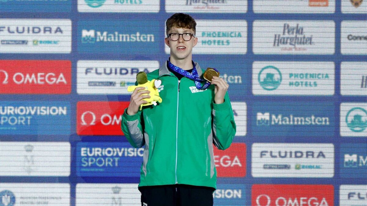 SECOND GOLD: Daniel Wiffen of Ireland receives his gold medal after winning the men's 1500m freestyle at the European Short Course Swimming Championships 2023. Pic: Nikola Krstic/Sportsfile