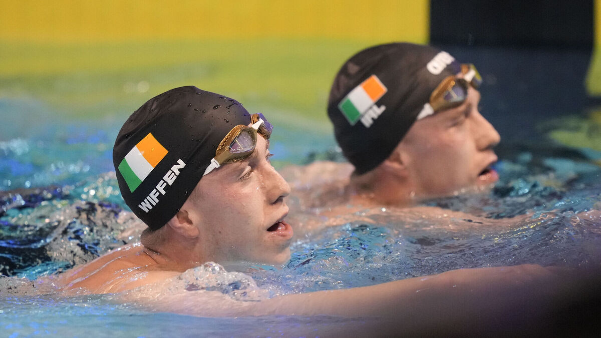 Ireland's Daniel Wiffen, left, exits the pool along with his twin brother, Nathan Wiffen, after winning the gold medal in the Men's 1500m Freestyle Final. Pic: AP Photo/Andreea Alexandru