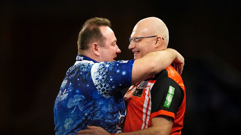 Brendan Dolan reacts after his match against Mickey Mansell (right) on day eight of the Paddy Power World Darts Championship at Alexandra Palace. Pic: Zac Goodwin/PA Wire.