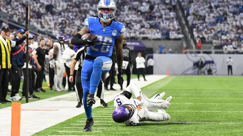 Jahmyr Gibbs #26 of the Detroit Lions scores a rushing touchdown against Mekhi Blackmon #5 of the Minnesota Vikings during the second quarter at U.S. Bank Stadium. Pic: Stephen Maturen/Getty Images