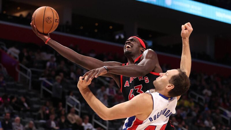 STRETCH: Toronto's Pascal Siakam drives to the basket against Bojan Bogdanovic of the Detroit Pistons.