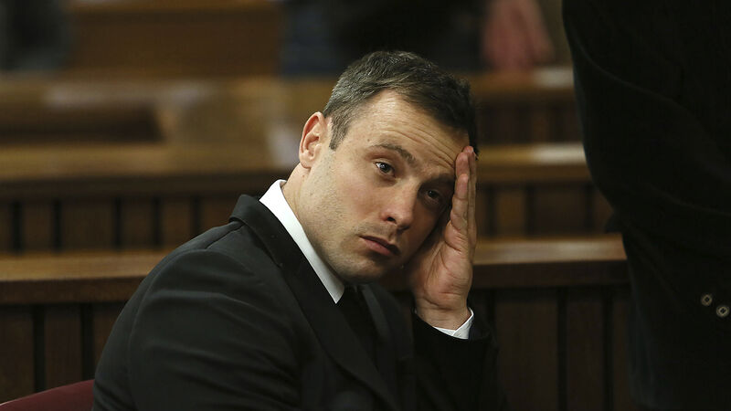 Oscar Pistorius gestures, at the end of the fourth day of sentencing proceedings in the high court in Pretoria, South Africa, Thursday, Oct. 16, 2014. Pic: Alon Skuy/Pool Photo via AP, File