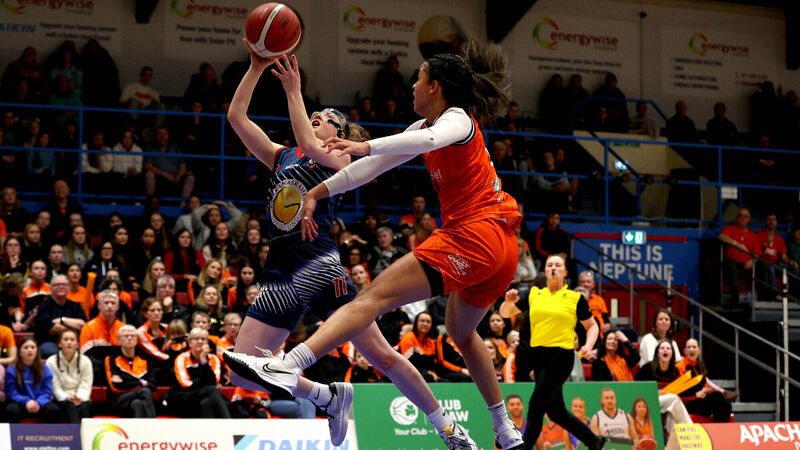 HIGH AND MIGHTY: Killester’s Jiselle Thomas and Edel Thornton of Gurranabraher Credit Union Brunell. Picture: INPHO/Ryan Byrne