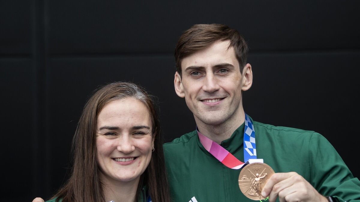 TEAM SELECTION: Kellie Harrington and Bronze medalist, Aidan Walsh pictured this afternoon at Dublin Airport with her Olympic Gold Medal on her return from Tokyo. Picture: Colin Keegan, Collins Dublin