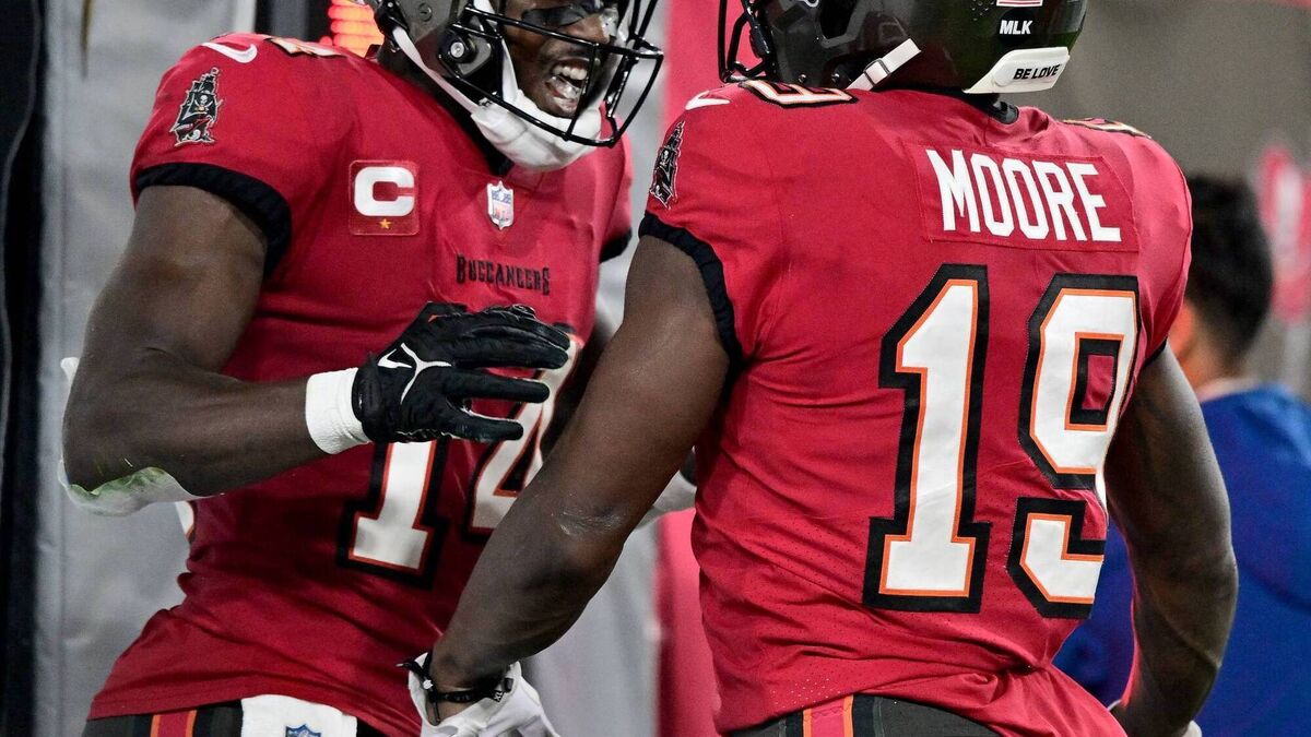 WILD CARD PLAY OFFS: David Moore #19 of the Tampa Bay Buccaneers celebrates with Chris Godwin #14 after scoring a 44 yard touchdown against the Philadelphia Eagles during the first quarter in the NFC Wild Card Playoffs at Raymond James Stadium on January 15, 2024 in Tampa, Florida. Pic: Julio Aguilar/Getty Images