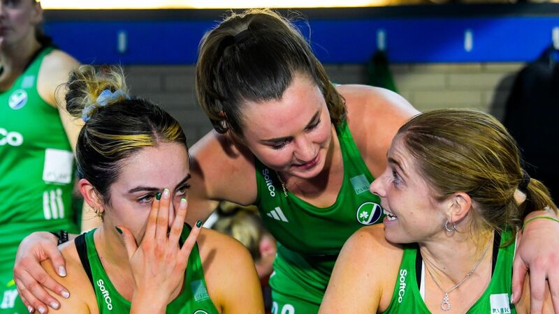 Ireland’s Hannah McLoughlin, Deirdre Duke and Kathryn Mullan celebrate after the game.