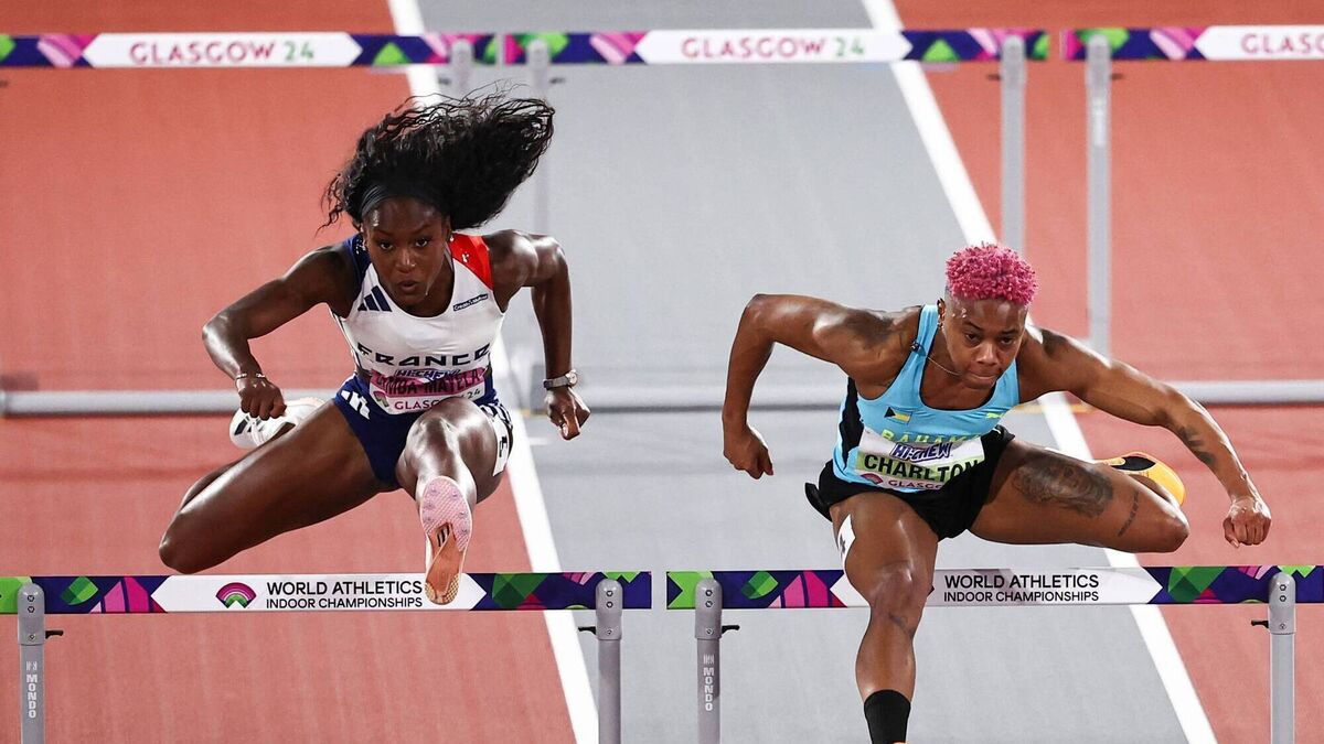France's Cyrena Samba-Mayela (L) and Bahamas' Devynne Charlton compete in the Women's 60m hurdles final during the Indoor World Athletics Championships in Glasgow. Pic: Anne-Christine POUJOULAT, AP