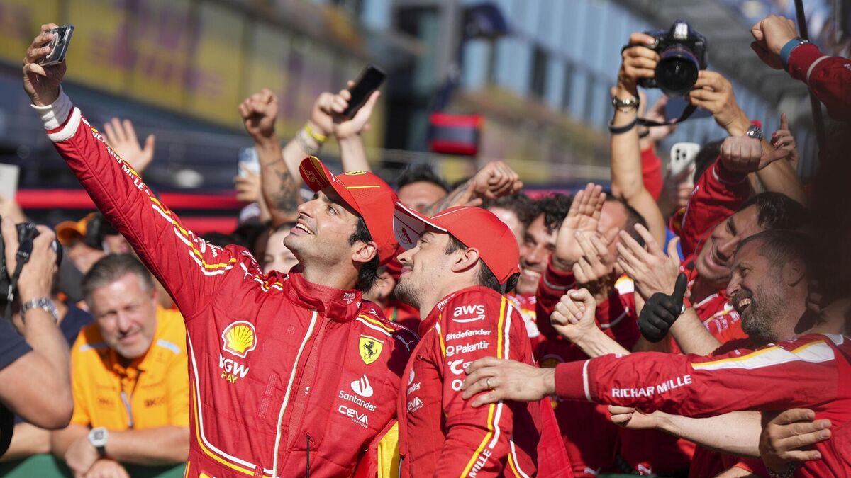 SMILE: Ferrari's Carlos Sainz Spain takes a selfie with teammate Charles Leclerc after winning the Australian Formula One Grand Prix at Albert Park, in Melbourne.