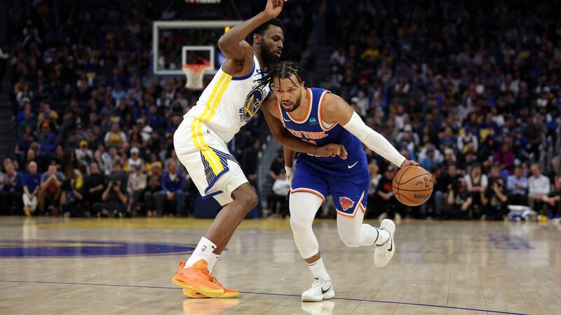 Jalen Brunson of New York Knicks is guarded by Andrew Wiggins of the Golden State Warriors at Chase Center.