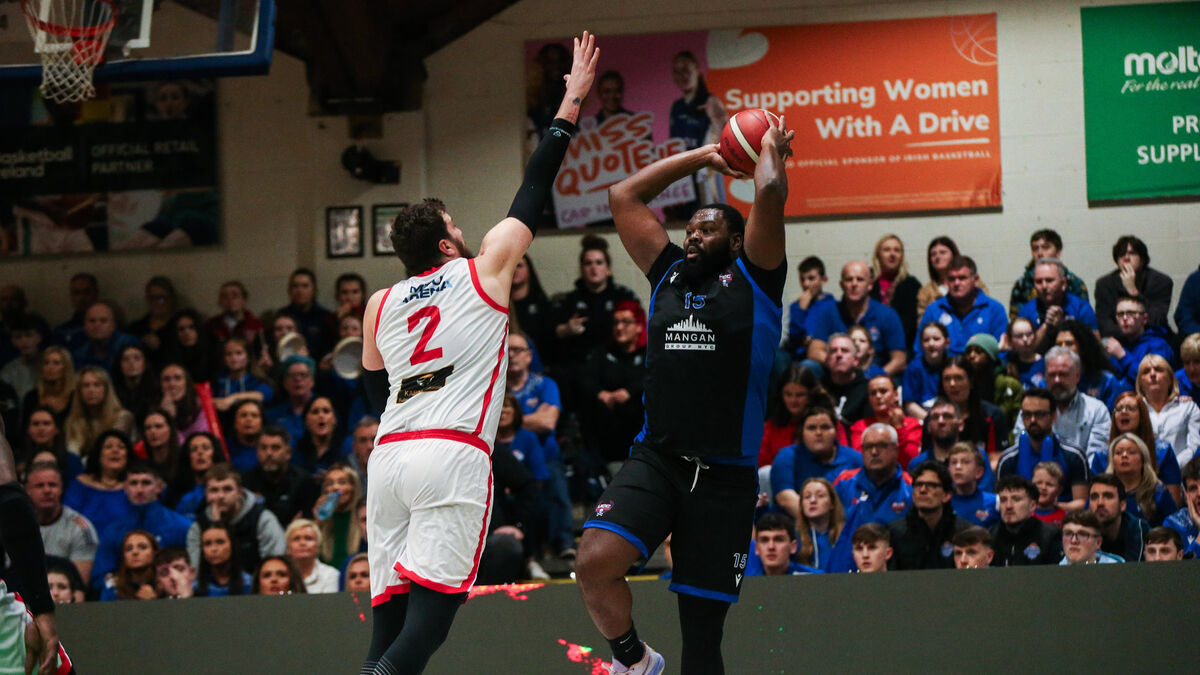 UCC Blue Demons' Elijah Tillman is challenged by Nikola Roso of Irish Guide Dogs Ballincollig @MTU