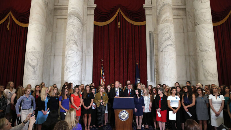 SETTLEMENT: Sen. Jerry Moran, R-Kansas, center left, and Sen. Richard Blumenthal, D-Conn., attend a news conference with dozens of women and girls who were sexually abused by Larry Nassar, a former doctor for Michigan State University athletics and USA Gymnastics, July 24, 2018, on Capitol Hill in Washington. Pic: AP Photo/Jacquelyn Martin, File