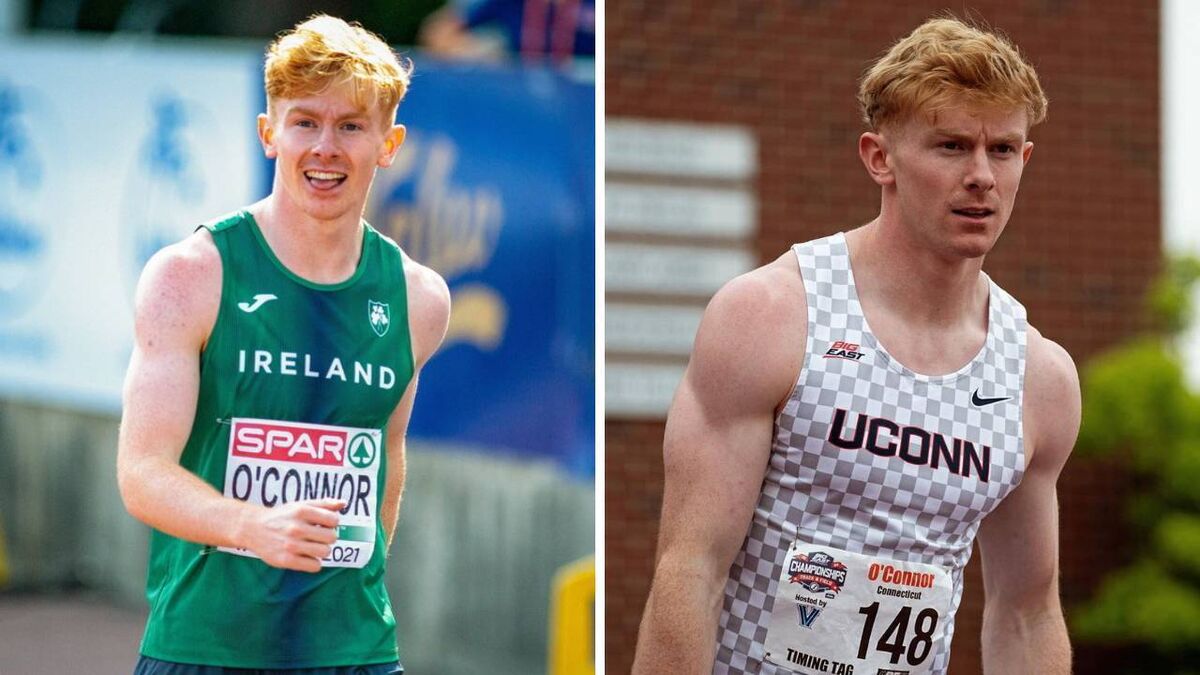 Diarmuid O'Connor during the 2021 European U20 Athletics Championship (left) and competing for the University of Connecticut during the 2024 Big East Track and Field Championships (right). Pictures: Sportsfile / Diarmuid O'Connor/Instagram