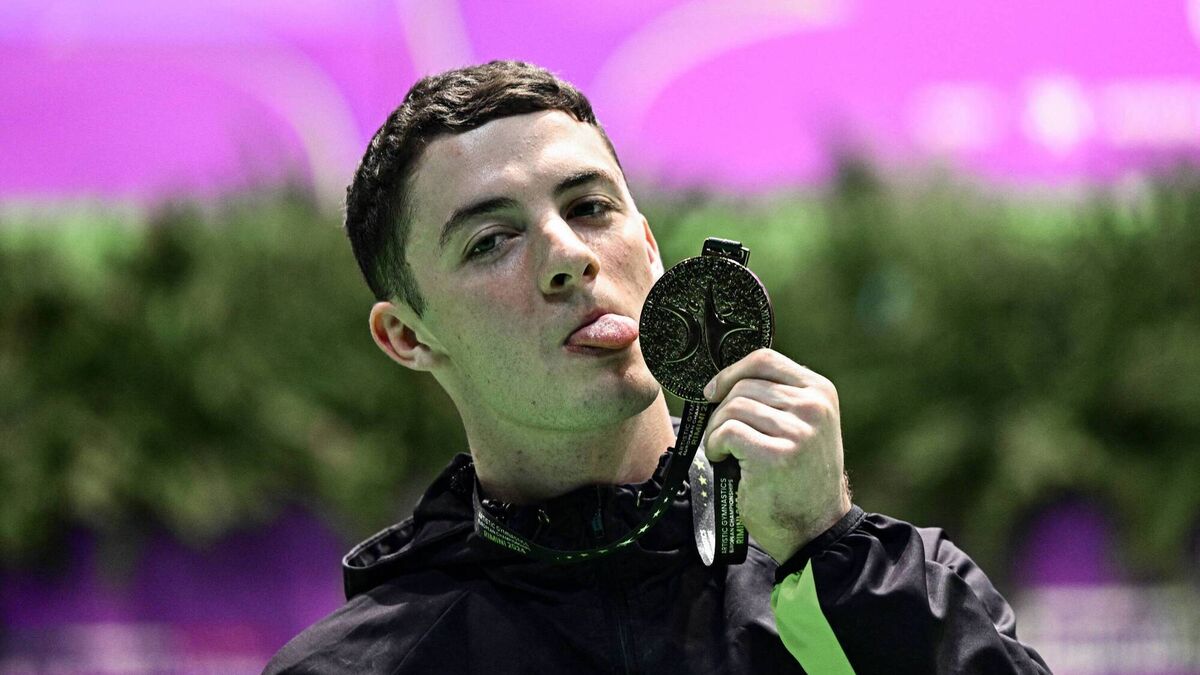 CONTENT CREATORS: First-placed Ireland's Rhys McClenaghan celebrates on the podium following the pommel horse during the Men's Finals event at the Artistic Gymnastics European Championships, in Rimini. Pic: GABRIEL BOUYS / AFP