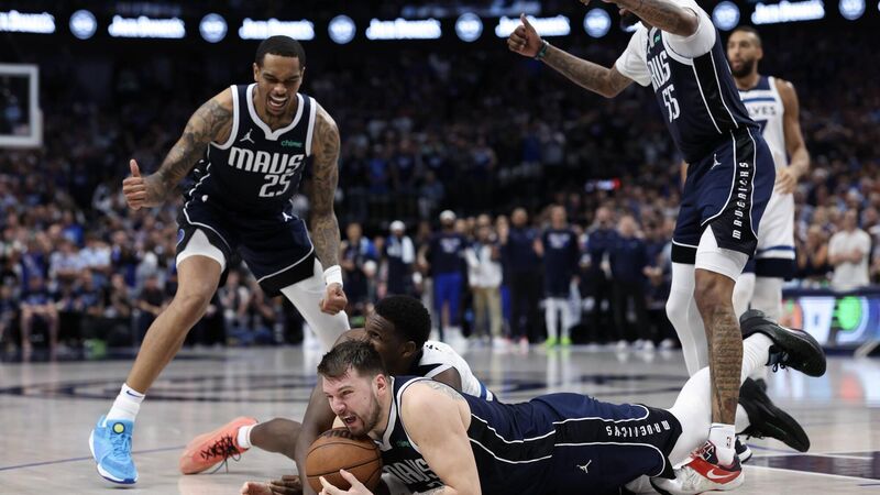 Anthony Edwards of the Minnesota Timberwolves and Luka Doncic of the Dallas Mavericks battle for a loose ball. Pic: Matthew Stockman/Getty Images)