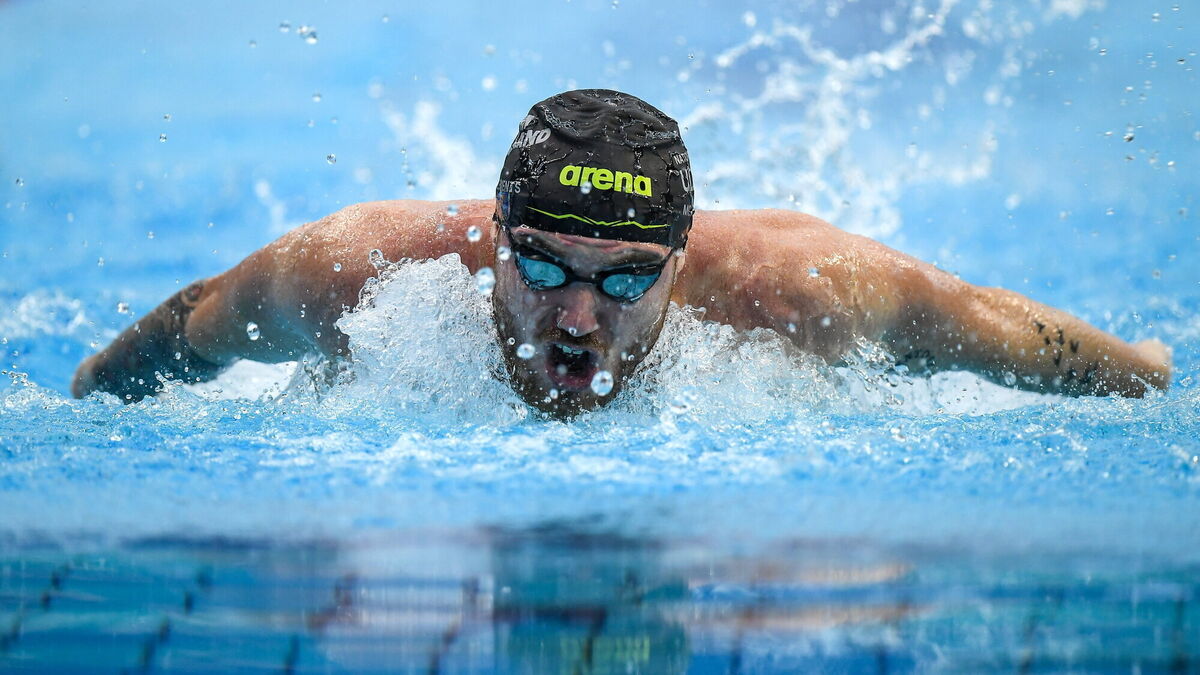 Barry McClements of NCU A competes in the Men's 100m Butterfly Heats during day two of the Ireland Olympic Swimming Trials. Pic: Shauna Clinton, Sportsfile