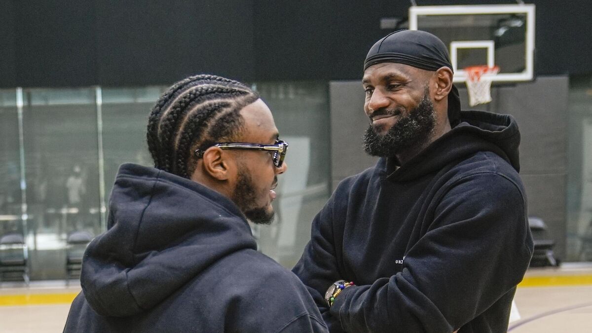 LIKE FATHER, LIKE SON?: Los Angeles Lakers draft pick Bronny James and his father, LeBron James, share a light moment as they arrive for the NBA basketball team's news conference. AP Photo/Damian Dovarganes.
